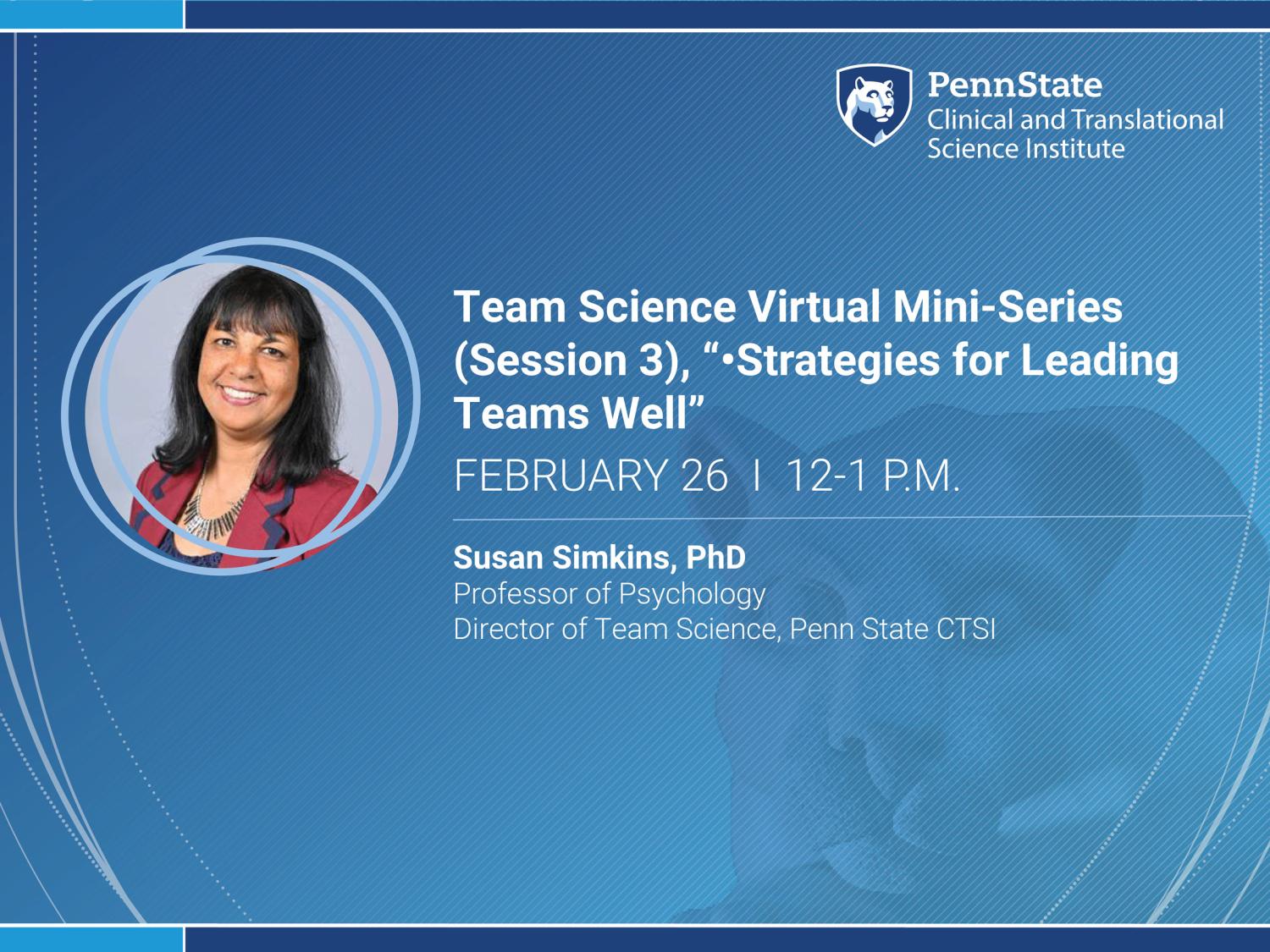 Penn State Clinical and Translational Science Institute (CTSI) will host a three-part virtual mini-series focused on Team Science, led by Susan Simkins, director of team science with Penn State CTSI. Designed for researchers, staff and leaders working in collaborative environments, the series will provide practical, evidence-based strategies to help teams function more effectively and without the misalignment that so often slows good science down.