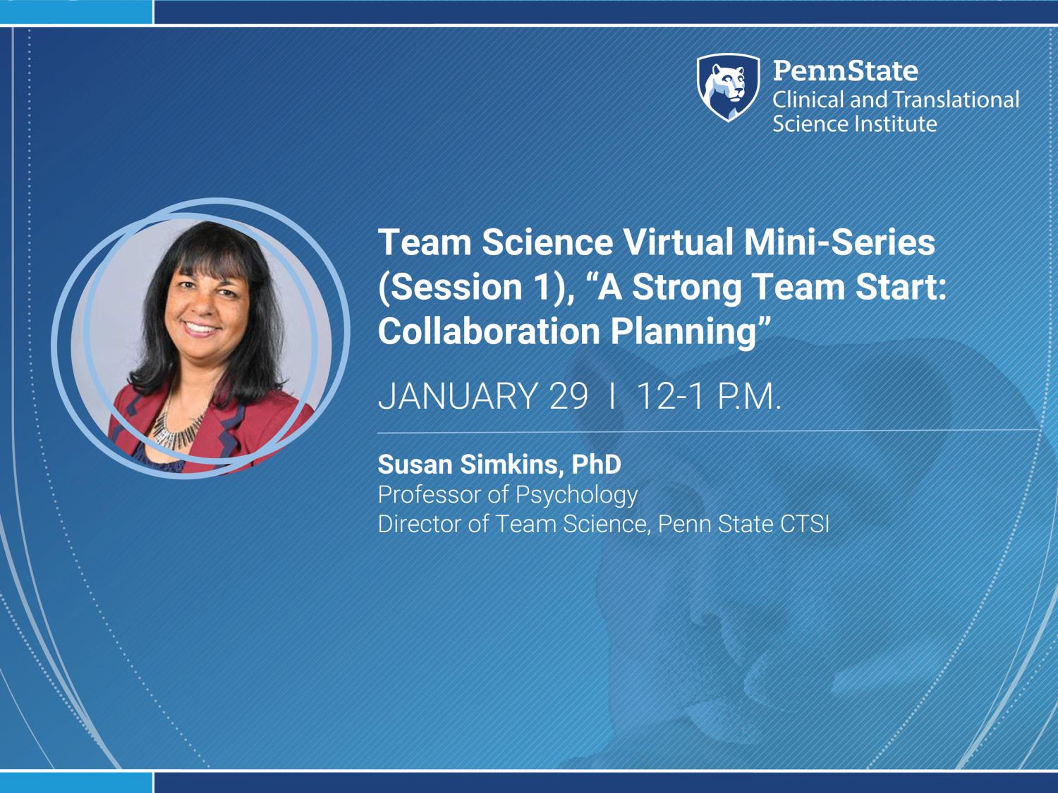 Penn State Clinical and Translational Science Institute (CTSI) will host a three-part virtual mini-series focused on Team Science, led by Susan Simkins, director of team science with Penn State CTSI. Designed for researchers, staff and leaders working in collaborative environments, the series will provide practical, evidence-based strategies to help teams function more effectively and without the misalignment that so often slows good science down.